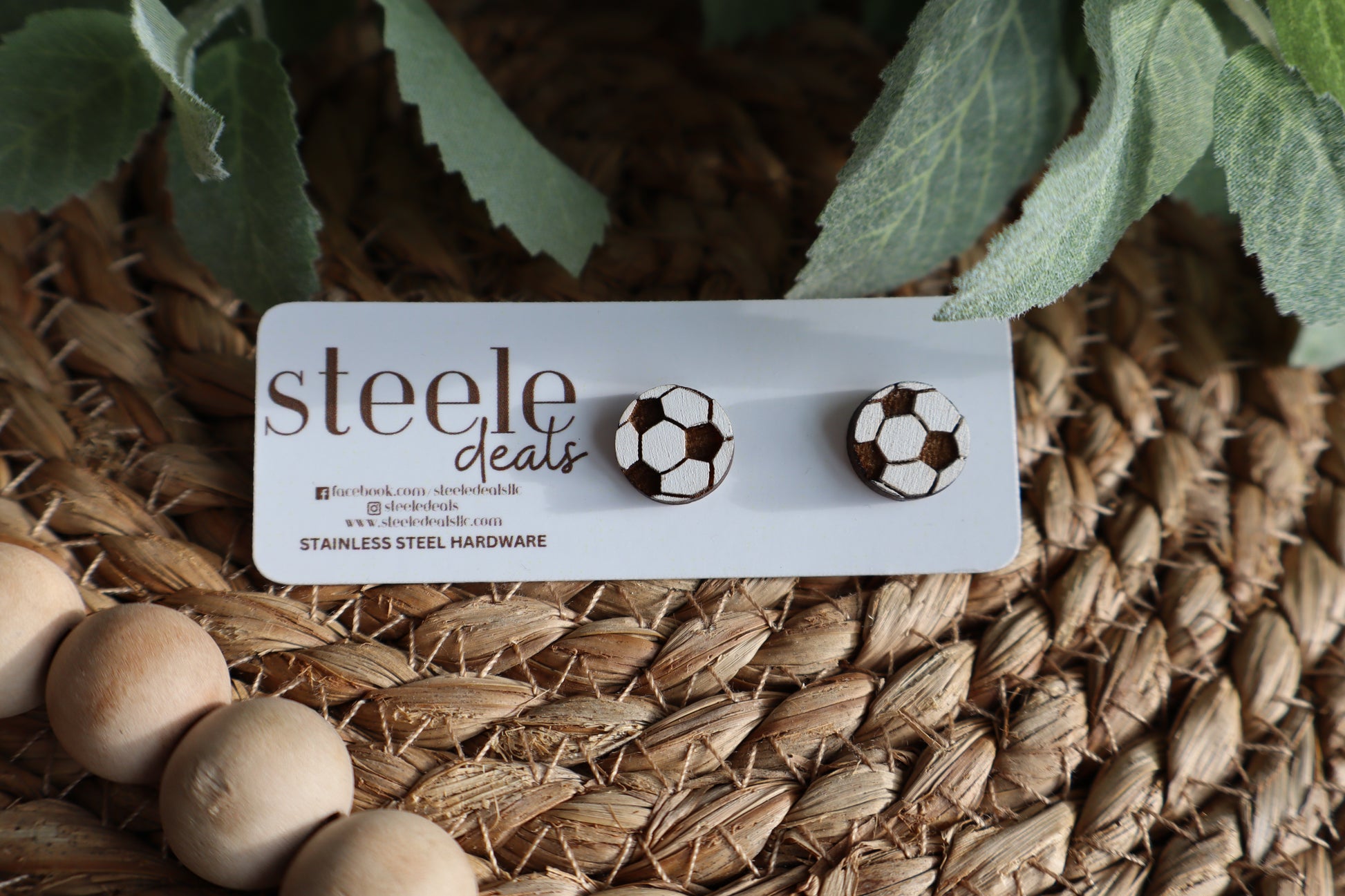 Kick up your style with these wooden stud earrings in the shape of a soccer ball. Perfect for soccer lovers, these earrings add a playful touch to any outfit. Show off your love for the game with these quirky, unique earrings.